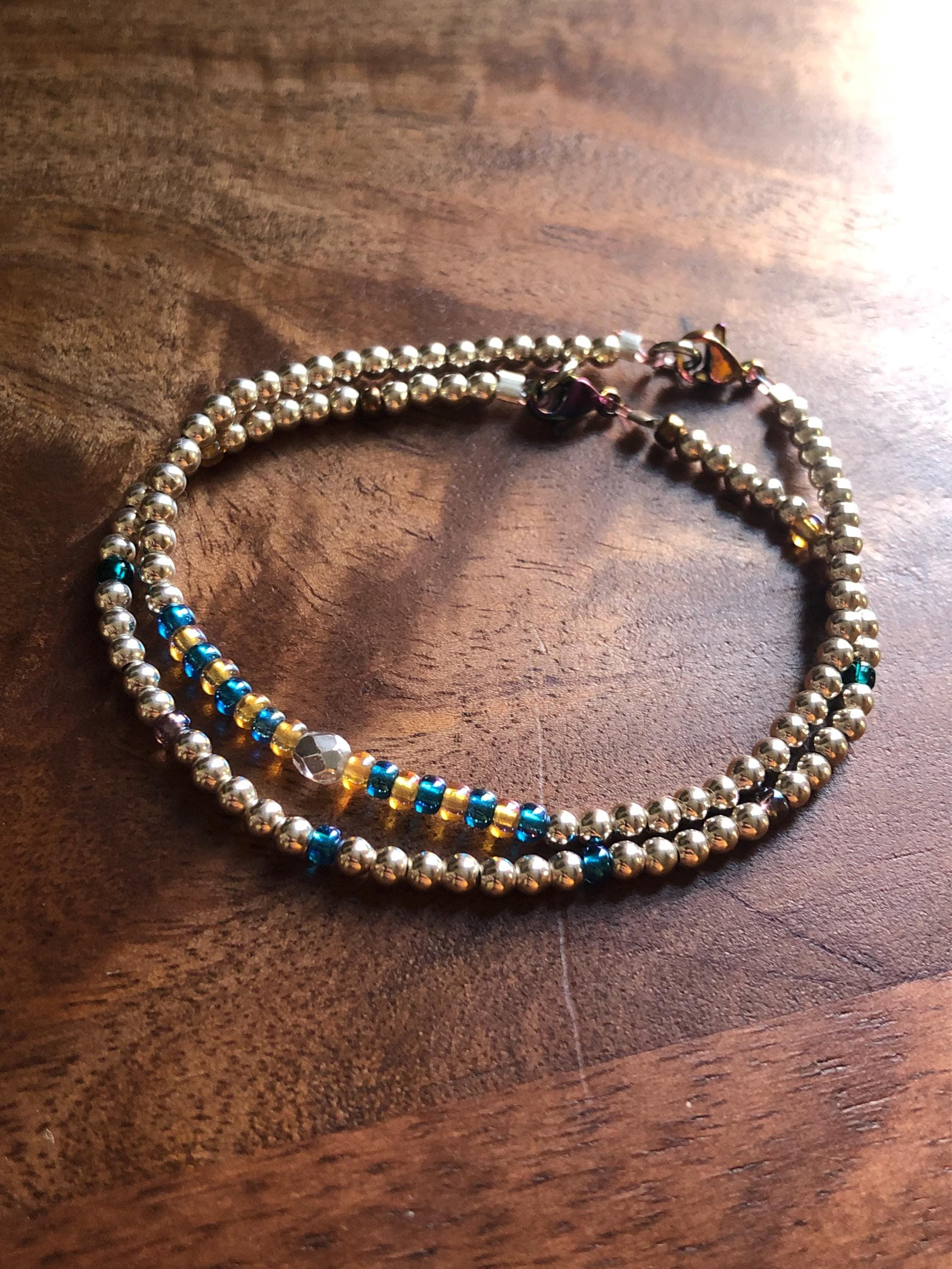 A beautiful 925 silver bead bracelet set of 2, designed with the highest quality sterling silver 3mm beads, and 3mm green, blue, lilac, gold and bronze glass beads. One bracelet has a different design with blue and gold beads and a large central iridescent Czech bead. These sparkle wonderfully in the light and complement any outfit. The clasps are multi-coloured rainbow stainless steel.